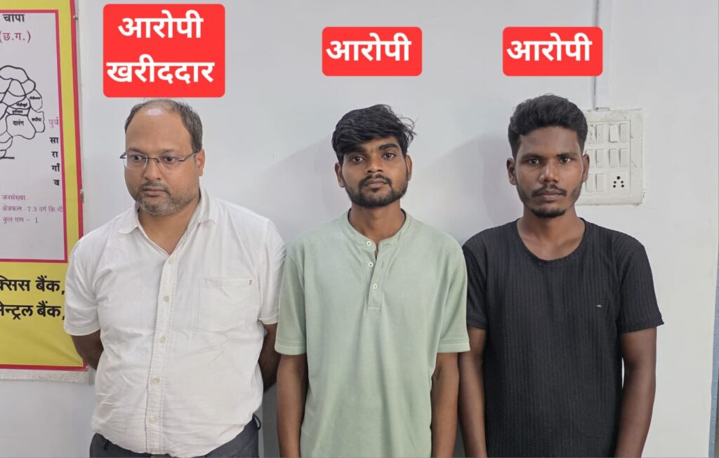 चांपा (सलवा जुडूम मीडिया) गिरफ्तार आरोपि :-1. मनोज कुमार निषाद पिता सियाराम निषाद उम्र 27 वर्ष, शंकर नगर चाम्पा, 2.सूरज दास मानिकपुरी पिता मंगल दास मानिकपुरी उम्र 31 वर्ष साकिन बिरगहनी थाना जांजगीर। खरीददार, नरेंद्र शर्मा पिता राम कुमार शर्मा उम्र 40 वर्ष साकिन वार्ड नं. 20 कोरवा पारा चाम्पा जिला जांजगीर चांपा।