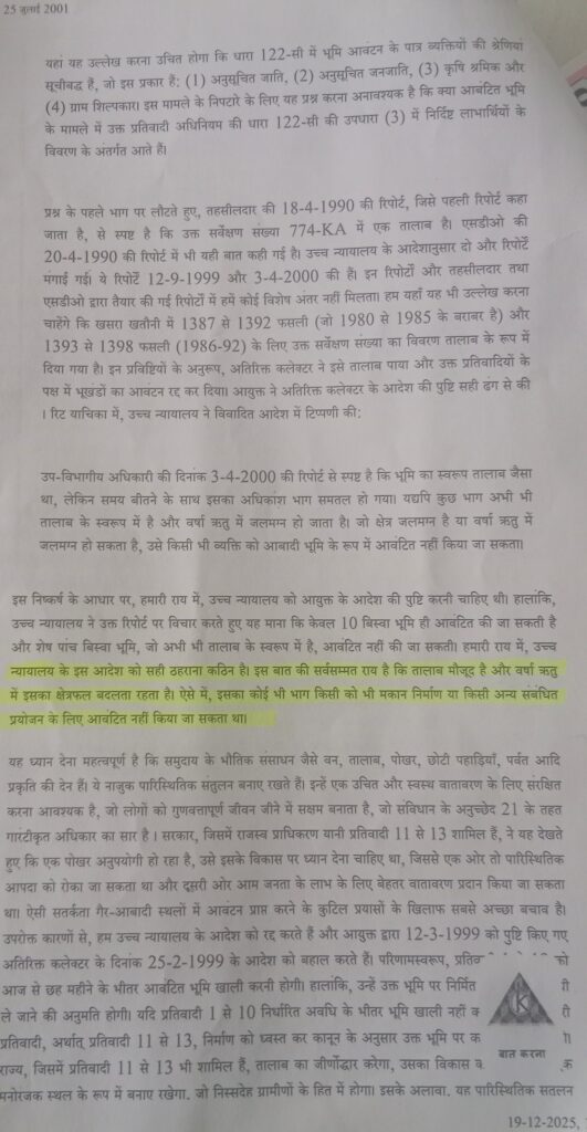 जिसमें किसी भी जल स्रोत तालाब नदी पोखर स्थल को पाटे जाने पर सख्त रोक लगाई जाने का निर्देश दिया गया है अब देखना होगा कि सुप्रीम कोर्ट की गाइडलाइन एनजीटी के आदेश का पालन नगर पालिका, तहसील व एसडीएम किस हद तक कर पाने सफल साबित होते हैं तहसीलदार के स्थगन आदेश के बाद भी तालाब स्वामी द्वारा निर्माण कार्य नहीं रोके जाने पर बड़ी कार्रवाई किया जाना आवश्यक हो गया है इसमें बनाई गई दुकानों को तोड़कर लच्छी बंध तालाब को पुराने स्वरूप में लाया जा सकता है।